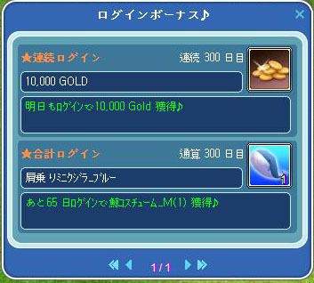 今朝ログインすると連続300日目、通算300日目の窓が出ました^^