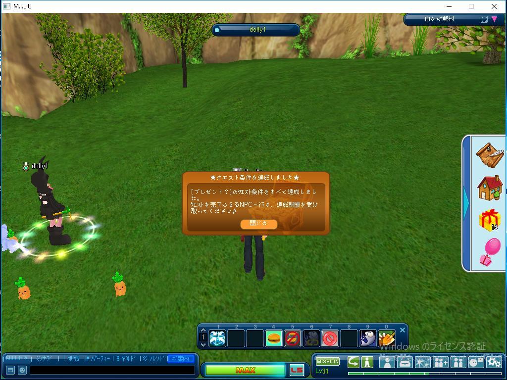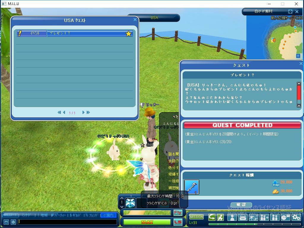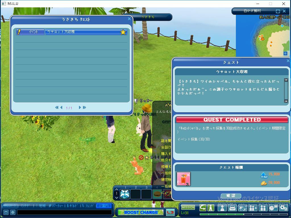 今日はウサロット大収穫のクエストで 目標のイベント採集を30回することで、 そのクエストを完了しました。