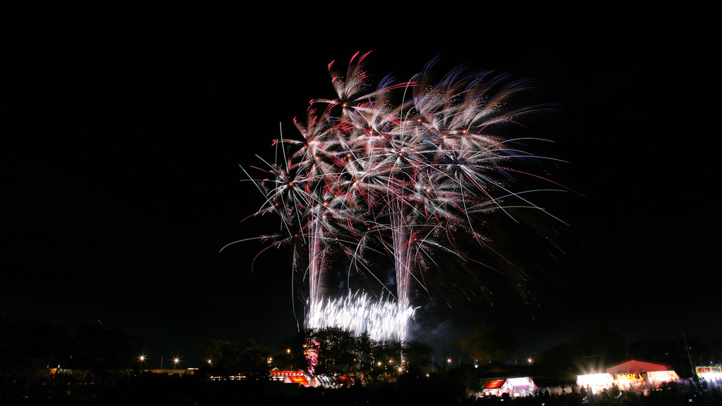 強風のため流される花火。
