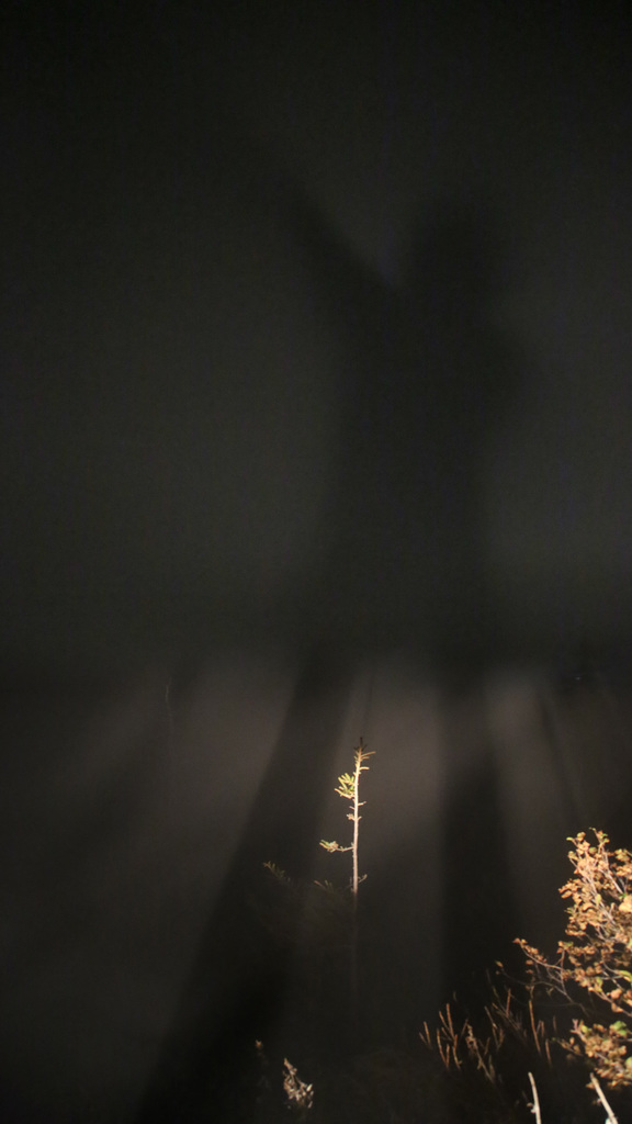 ↓ ヘッドライトに照らされて霧に映る僕の影。この先は崖のはずなのだがまったく見えない。