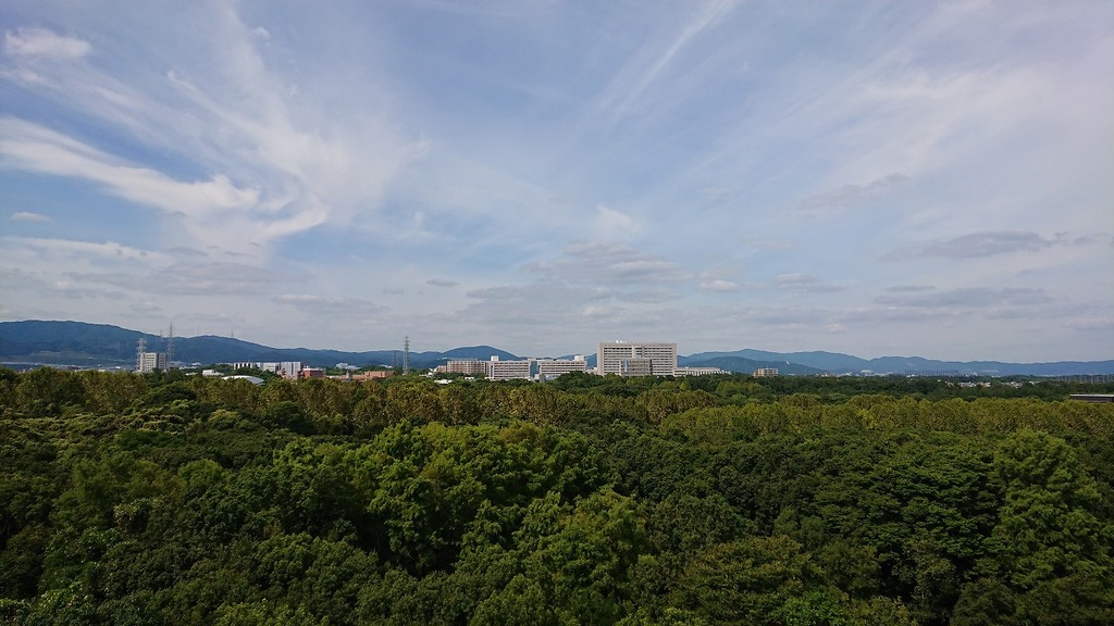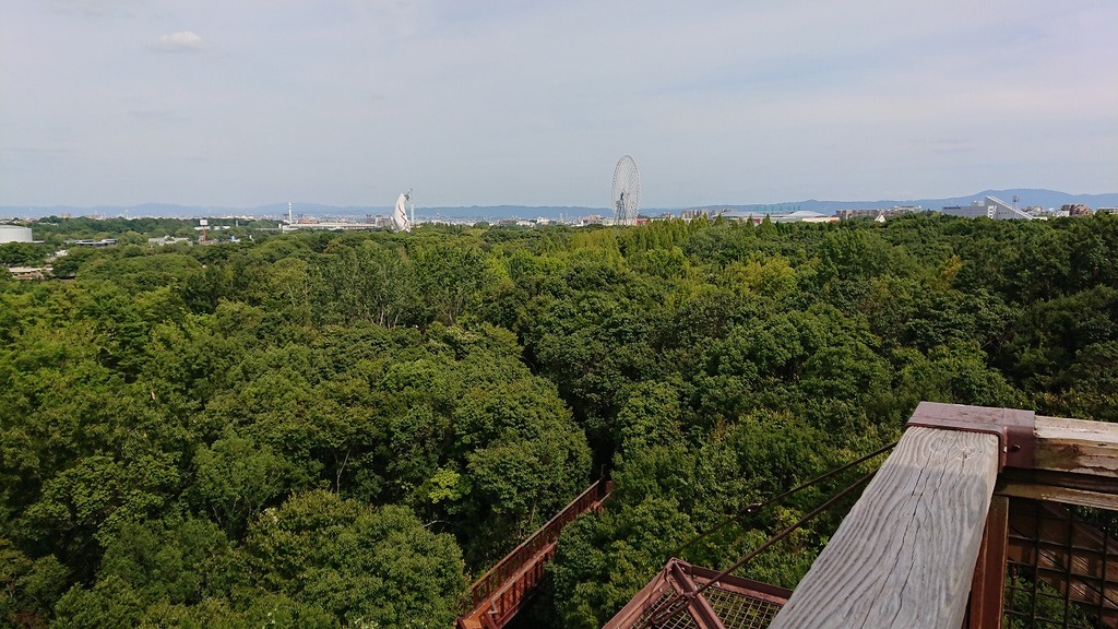 眼下に先程歩いてきたソラード 緑の向こうには太陽の塔とエキスポシティの観覧車です♪