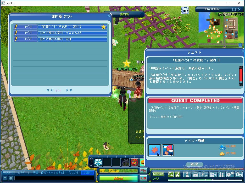 その次は、案内板クエストの紅葉イベント冬支度 案内3で、イベント魚を100匹釣ることを目指し ましたが、こちらもなんとか達成しました。