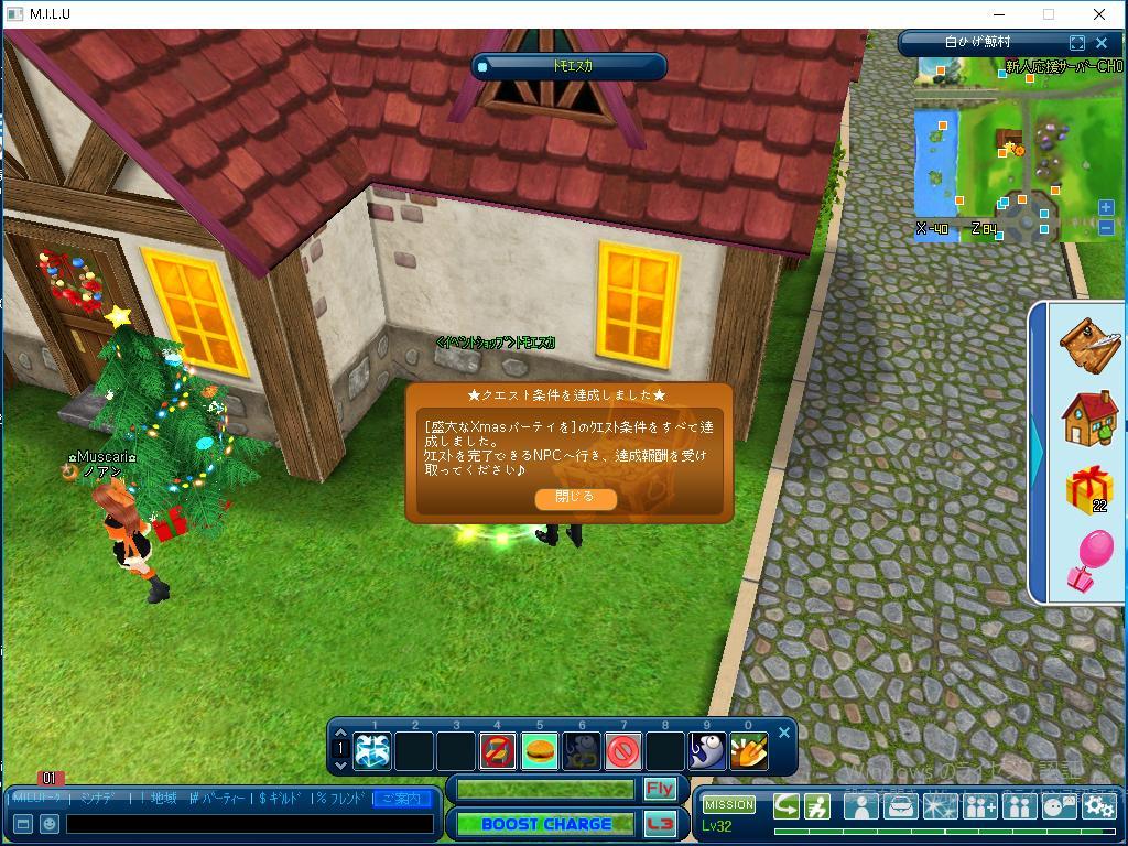 その次は、トモエスカクエストのイベントの、 「盛大なXmasパーティーを」でした。 このクエストでは、トモエスカさんから、 「XmasジングルベルM」をひとつ 購入することを目指しました。