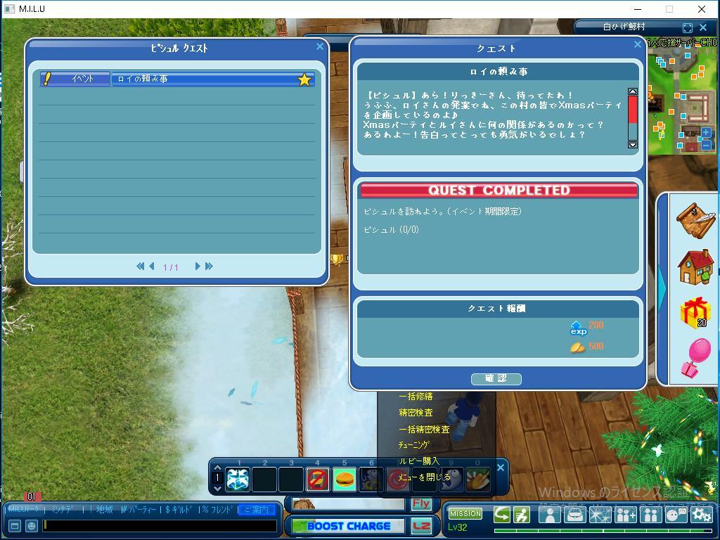 その後は、トモエスカさんから購入した「XmasジングルベルM」 を使って、「クリスマスプレゼントボックス」を30個集める ことを目指しますが、本日はそのうち、時間の都合から、 わずかひとつの「クリスマスプレゼントボックス」 だけを手に入れました。 今日はメンテナンスのためにわずかな時間しか クエストに取り組めませんでした。 でも、とても楽しむことが出来たことが 良かったですね。 明日も楽しみます。 では、またです。