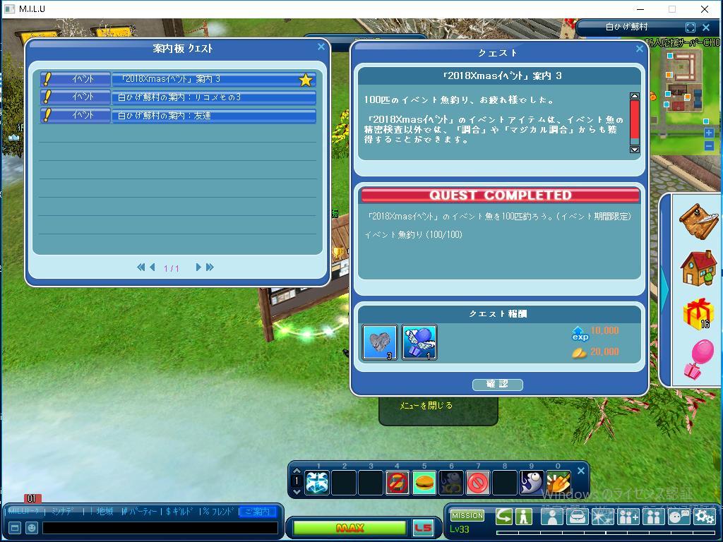 今日は、案内板クエスト案内3の イベント魚目標100匹を達成しました。