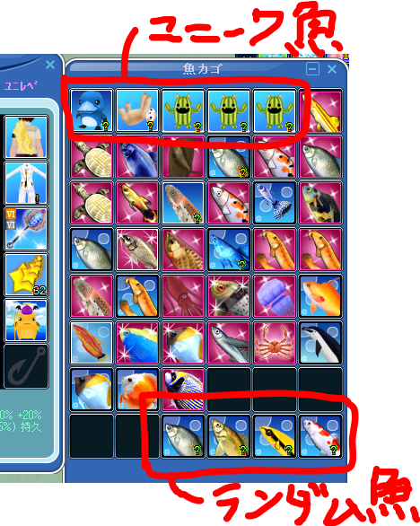 シーラカンスとランダム魚は材料餌で釣ったんですが、あれは当たりでした。