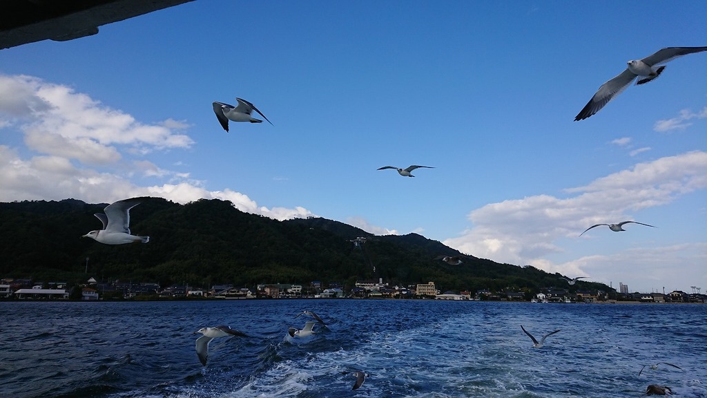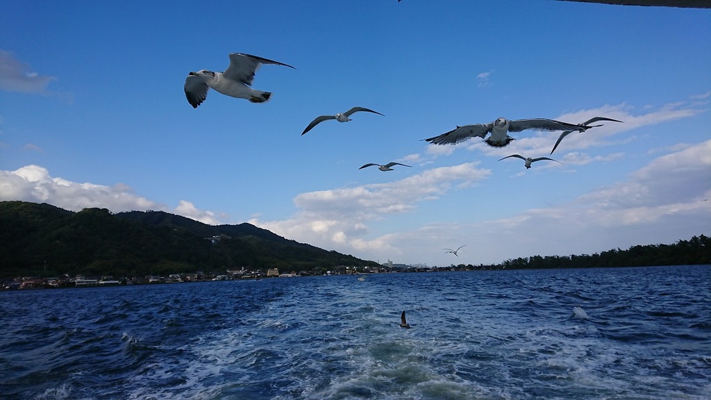 | 船に乗ってカモメに餌あげですかいいですね。海の景色もいいですね。 |