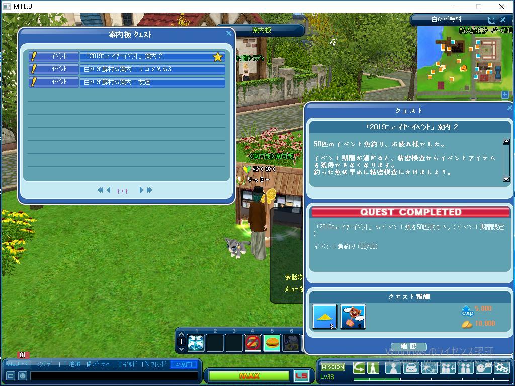 クエストの「2019ニューイヤーイベント」案内2 のイベント魚釣りの目標50匹を完了しました。