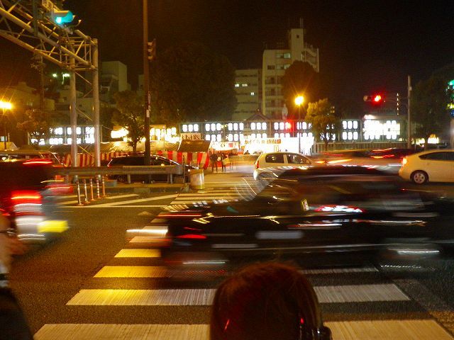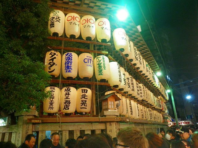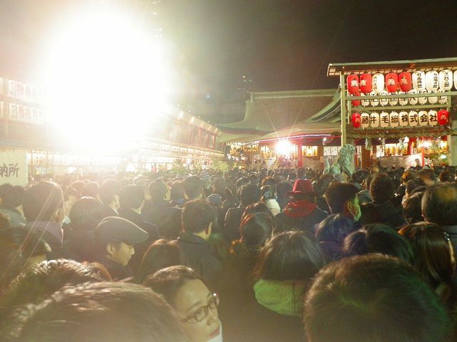本堂手前からの展望ですが、場内警備に「浪速警察署警備事務所」から場内アナウンスが休みなく行われ、人混みでの「スリ注意喚起」や「整列状態でのマナー寒気」や、「短気なお詣り(列後方からお賽銭投機)」の危険注意(後方から観てて空飛ぶ投げ銭の多さに地域性を感じる!大阪の恥でっせぇぇq(*`ε´*)p)を行っている、中継監視ブースは強烈ライト光線で逆光となり光に包まれてしまいました(左側の画像ネッ(oゝД・)b)
