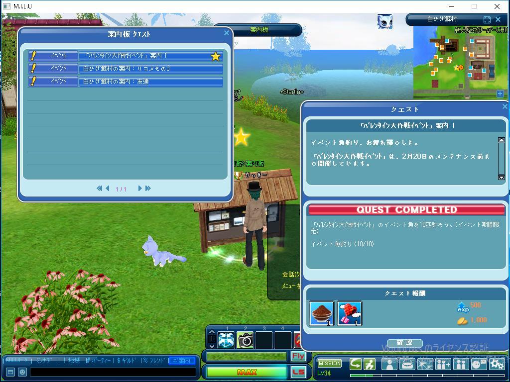 クエストはひとつだけ完了しました。 まだ未完成の進行中のクエストはふたつあります。 そのうち、チョコレート大作戦のイベントは 目標の30匹のうち、25匹でした。 また、バレンタイン大作戦の案内2のほうは、 目標の50匹のうち、14匹でした。