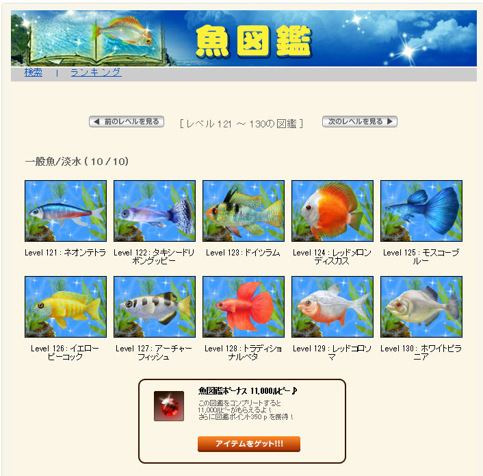 魚図鑑の淡水魚Lv121~Lv130が完成おめでとうございます^^