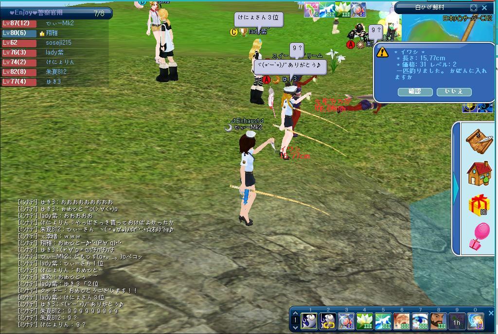 それで、タイムアップで集計に入ったのですが、私を含め7回捕まえたのが3名で同順位という結果になり、急遽イベ竿を使って下二桁の大きいサイズの魚を釣って順位を決めると言う展開に…w