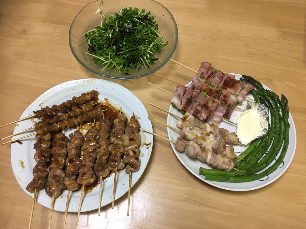 昨日は実家で、長州鶏なるブランド鶏のもも肉と家の畑で採れたアスパラをもらったので焼き鳥にしました。