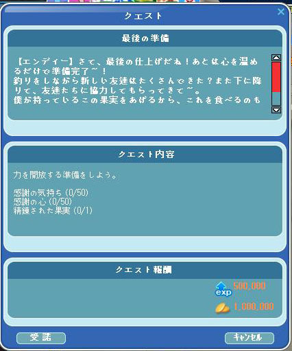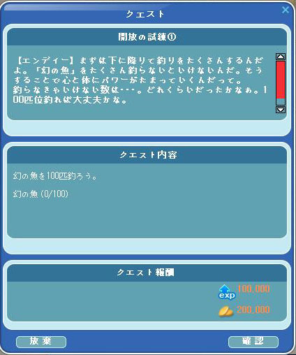 エンディを訪ねて、続きのクエスト「幻の魚を100匹釣ろう。」を受け取る