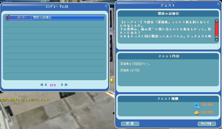 エンディに報告後、続きのクエスト「深海魚を100匹釣ろう。」を受け取る