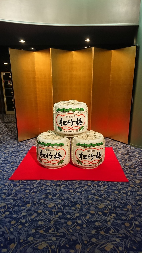 ホールからロビーに出ると鏡開きの、お酒が 振る舞われていました!