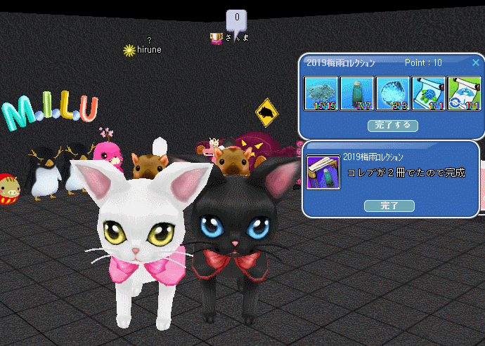 記念撮影っと~(*´ω`*)黒猫が見えるように、フレハウスにて(。-∀-)ィヒ♪材料コレブが精密で2冊目出たので!!!カップルハウスのタンスに放り込んで~コレブ完成式♪真っ暗なハウスでも、黒猫みえたね~ε-(´∀`*)ホッヌイグルミに混じって、かくれんぼ♪ って、遊んでた・・お肉w撮ってなかった・・・.+:。(*´-ω-`人)゚.+:。 soяяу゚.+:。 可愛かったよ攻撃魔法を習得された~てんてんさん! 命中!!!( ̄ω ̄)ニヤ...