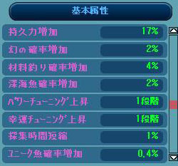 基本属性は、ユニーク魚確率増加が0.2%増えて0.4%になりました^^