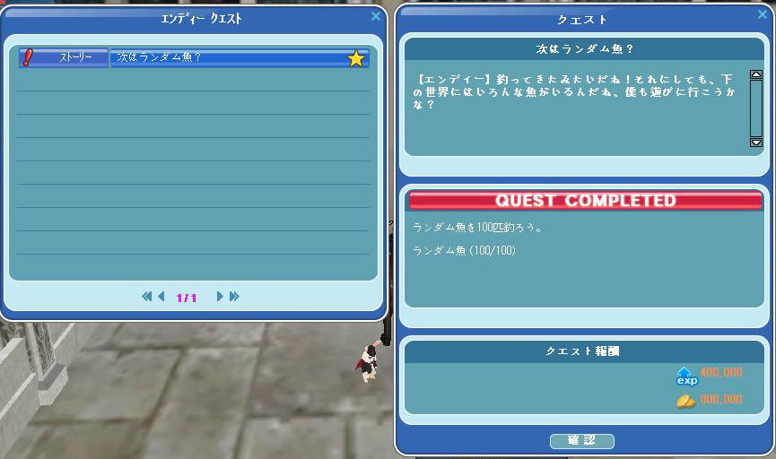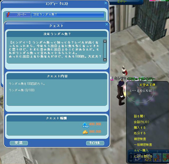 ランダム魚100匹のクエストが完了後、エンディーに報告に行って次のクエストを受けます。