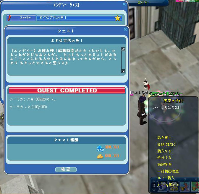 シーラカンス100匹のクエスト完了後、エンディーに報告に行くと次のクエストが発生します。