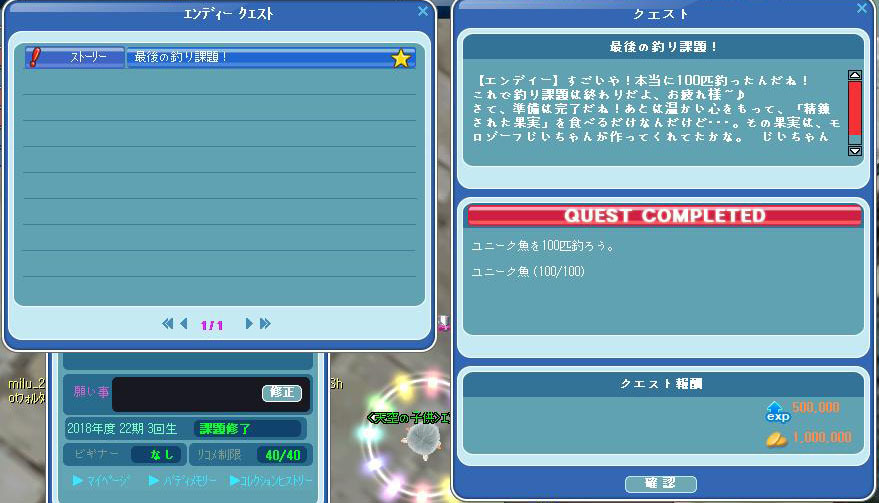 そして、やっとユニーク魚100匹のクエストが完了しました^^
