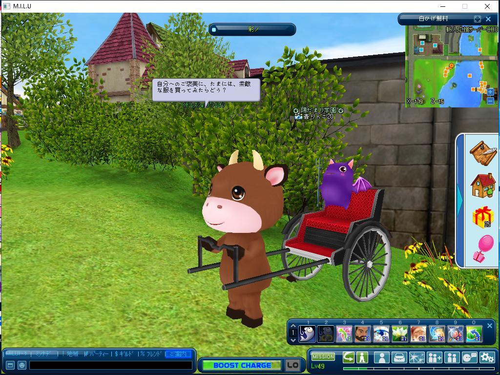 今日はメンテの日ですね、午前中に少しだけ入ったのですが ギルメンのかほみさんから牛車を頂いたので 少しだけですが乗り回して遊んでました(´▽`)