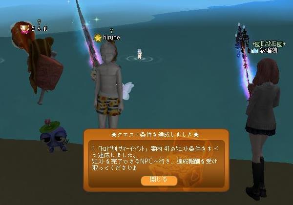 天気の子君の名は。も好かったけど、やっぱ描写が綺麗で【E】\_(`・ω・´)イイ!!雨粒とか、錆びた鉄の描き方とか…上空からの花火も凄い!!!アタイは好きな作品でした♪さて、MILUは…マナさんが叫んでて~~イケスから、上がれなかった!(右側)亀三郎、修理しといてね☆案内板のクエは、どっちも完了しましたん(´∀`*)ウフフ明日はメンテの日!通常メンテですねなんかパッとしないイベだけど、パッとしないまま終わるんだろうか・・w