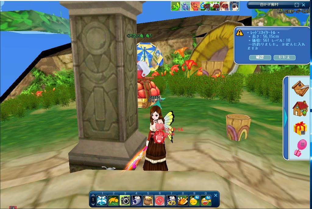 午前中は砂漠に居ました。シーラも釣れたし、キンググルテン消費してしまったので、餌を買って、天空へ。以前、翠川さんから貰っていた、天空の餌、エンジェルゼリーで釣ってみたら、赤いスカイタートルが釣れました。その後、ぼちぼちと、天空で採集をしていた私。レッドベリーが出てきてうれしかったなぁ。ではでは^^