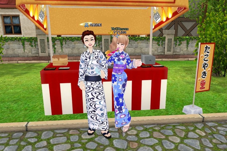 今度は 浴衣着てくれてたつっきーと タコ焼き露店の前で