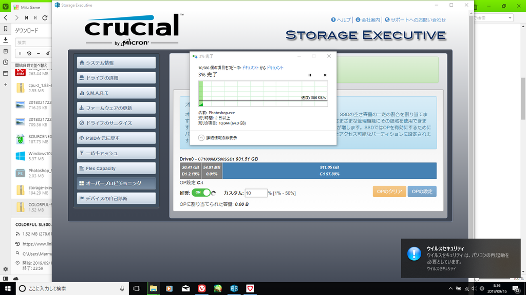 古いSSDから64GBくらいのデータを移動させようと、昨日の夜にセットして寝てたのだけれど・・・