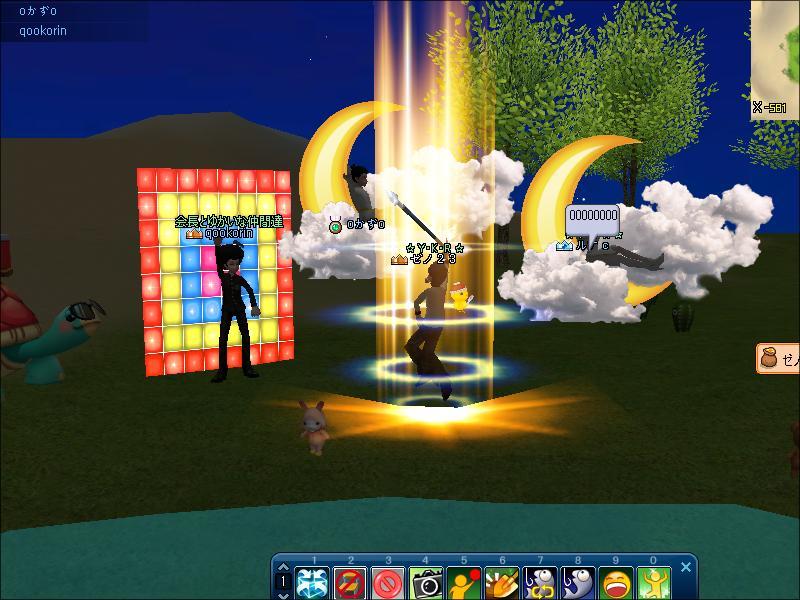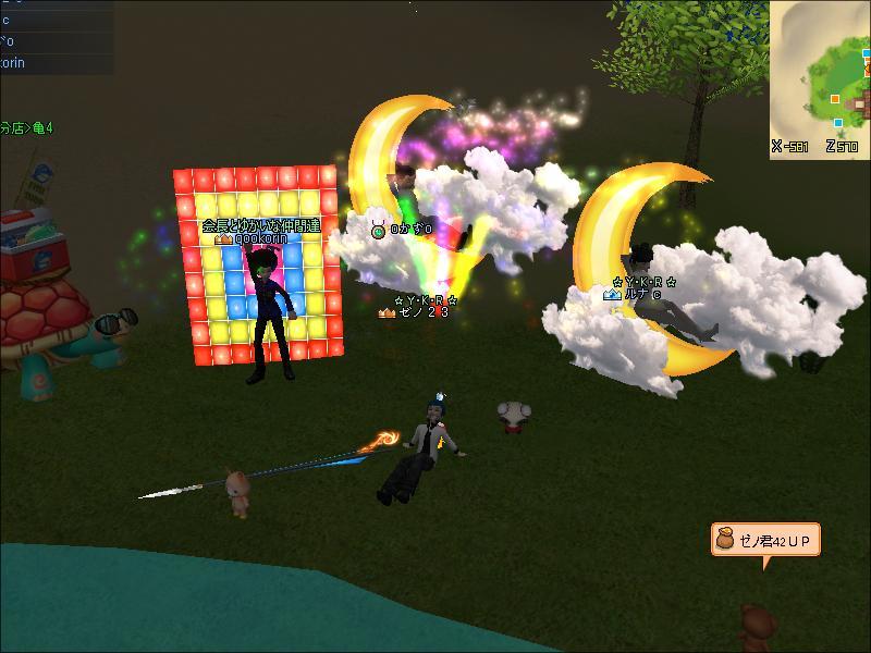 フレの、カズさん、くーさん、ルナさんに、祝っていただき^^ ど真ん中でくるりんとあがりました♪  そして、後ろで背景になりきる皆様方www 夜サバなのでかなり目立っていますなww さてと^^次は45UPをがんばりますかな^^