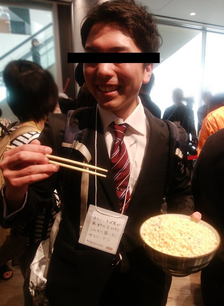 立ち食いそば屋で無料の天カスをこんもり盛ったサラリーマンのコスプレ