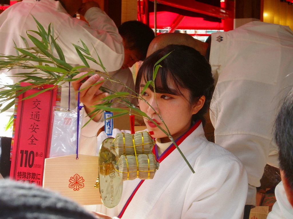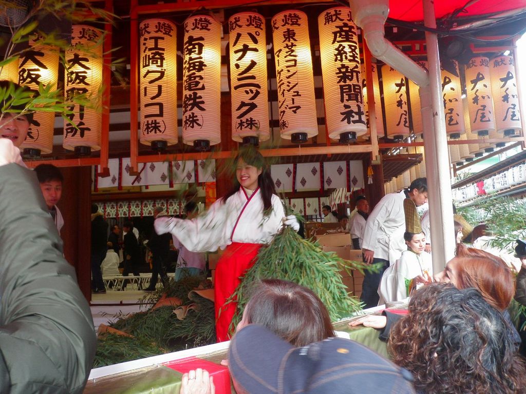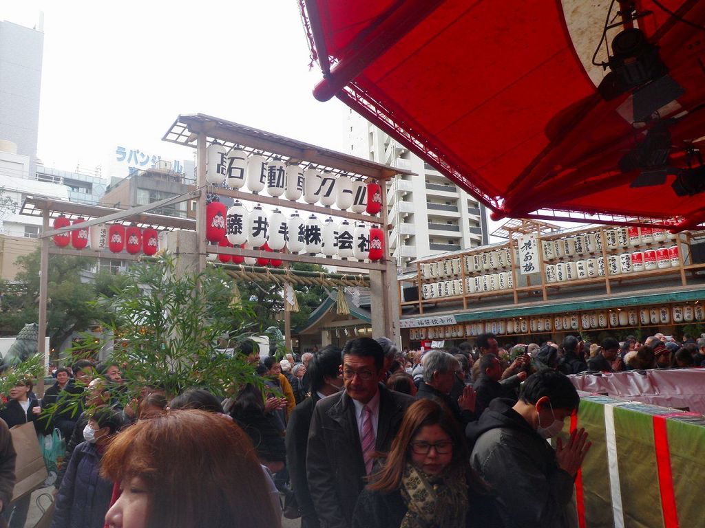 福笹(無料)の授与所では、気に入った枝振りや大きさの差さを求めて鈴なり状態、この日が初日の「福娘」さん達は、目の前に差出される福笹に、希望の縁起物「吉兆」を案内し売込み取付けてます・・・