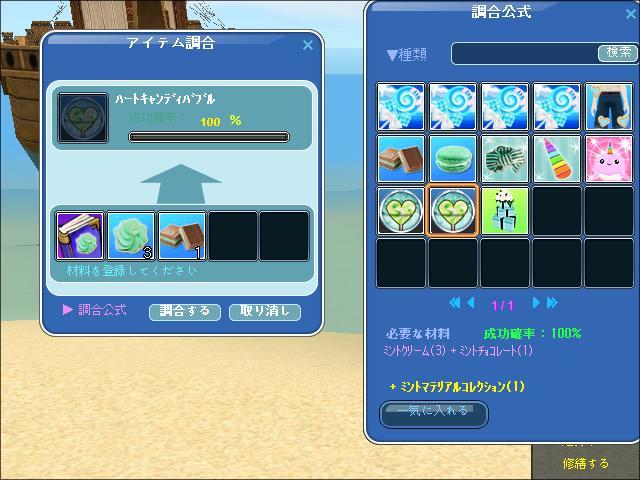 今回のコレブ活用の調合はスカイなんですね~、早速行って「ミントマテリアルコレクション」コレブ活用の「ハートキャンディバブル」をGETしましたー、成功確率100%って好いですね~♬
