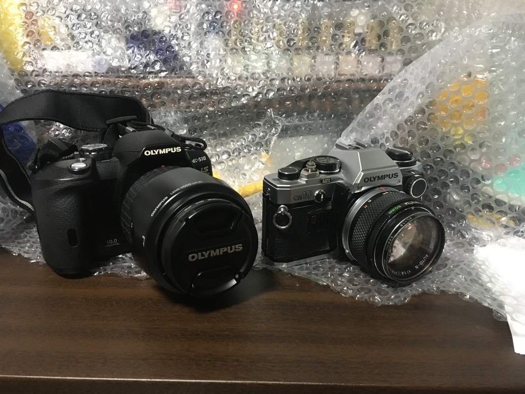 私の愛用しているフィルム一眼レフもちょうど同じオリンパス製なので、並べて撮ってみるとかなり小ぶりな機種である事がわかります。