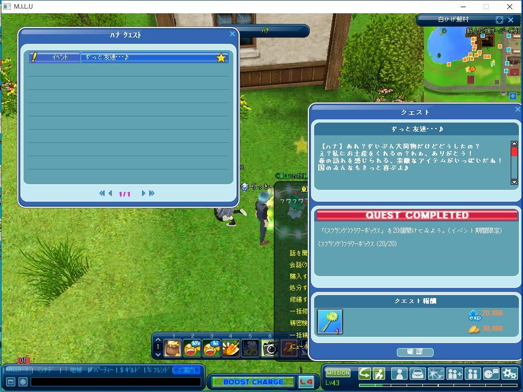 今日の前半は調子が良かったのですが、後半は 調子が悪かったです。 でも、今回のイベントのクエストは、ほとんど 完了できたみたいです。 その続きは、またあした、おこないたいですね。 今日はとても楽しかったです。 あしたも楽しみたいですね。 では、またです。