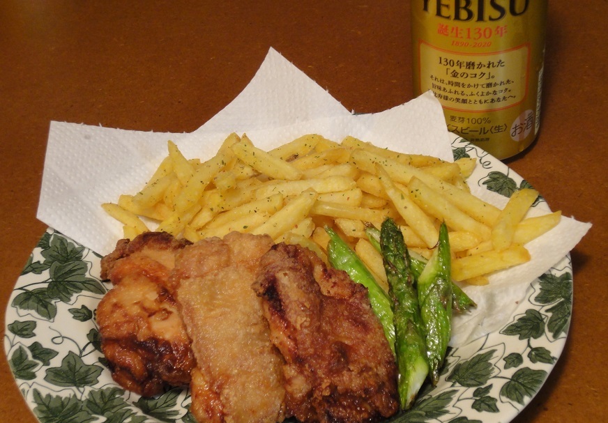 昨夜のご飯も いつもの唐揚げ&ポテト(アスパラ添え