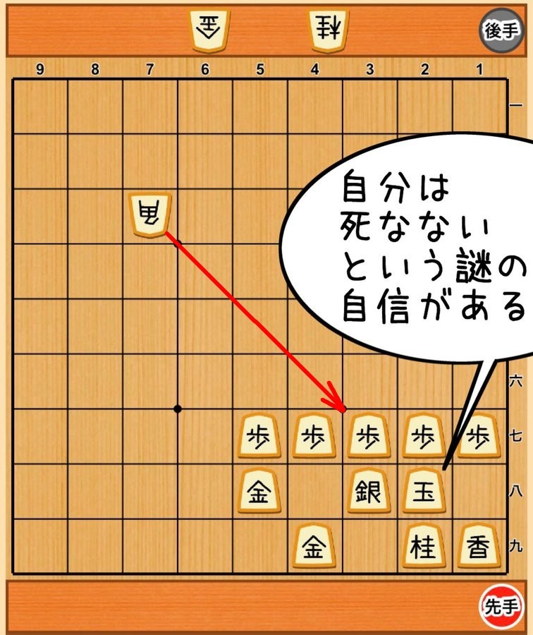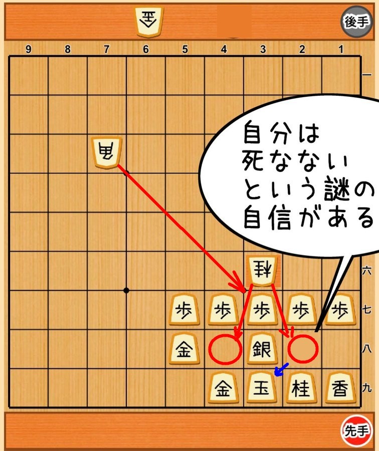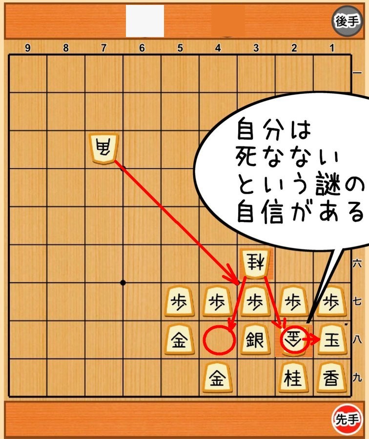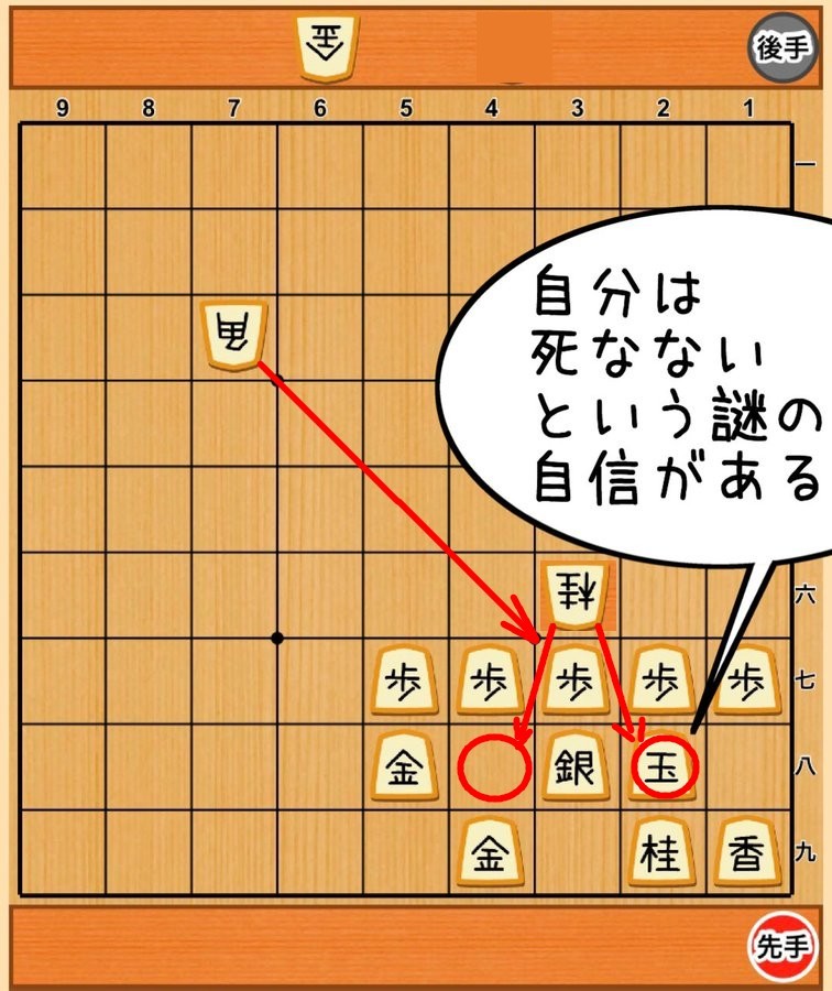 次の先手の時に、歩 で 桂 を取ることは出来るけど、 そうすると 角 の斜め攻撃が 玉 にまで届いてしまうので負けになる