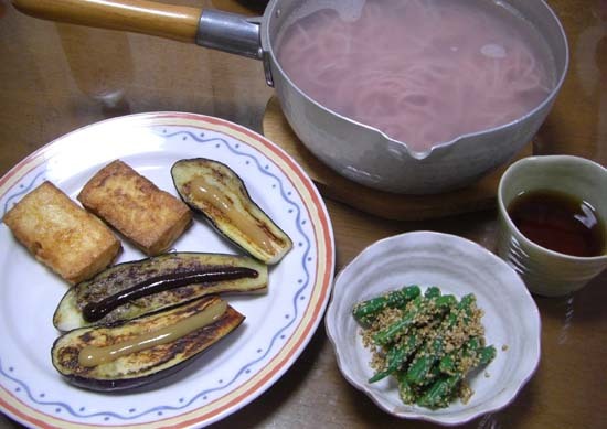釜揚げ梅うどん・なす田楽・焼厚揚げ・いんげんのごま和え