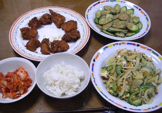 ゴーヤチャンプル中華風・鶏の唐揚げ甘酢漬け・きゅうりポン酢韓国風・白菜キムチ・ご飯