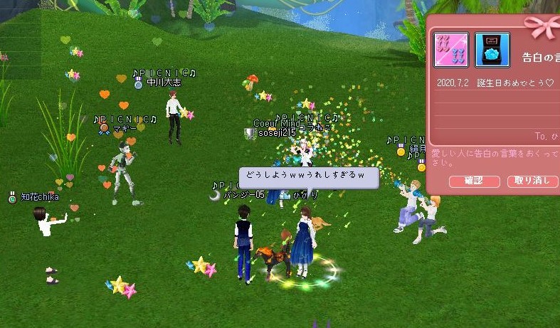 「掘りたい!言って、掘りながら、なんとなくひのりを中心に円になって(掘りながらだから、いびつでOK)0:05に、オレがOPで「せーの」って言うから、みんなでOPで「誕生日おめでとぉー」叫ぶ作戦。