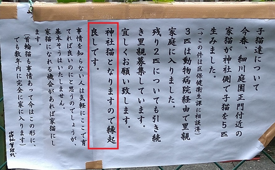 こんな張り紙が いぱーいあって、神社さんだか、にゃんこのお世話係さんか?