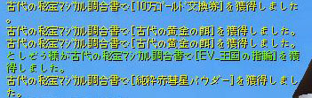 先日、なつきさんの日記に古代の秘宝マジカルで黄金の餌が出たと書いてあったので、 取引をお願いしましたが、ちょっと遅かったようで既に使われていましたw しかたがないので、倉庫を調べたら古代の秘宝マジカル調合書が10枚あったのでマジカルに挑戦^^ 結果は、なんとか2個ゲット出来ました^^ 使えないEVの緑文字が出たのでフレさんに押しつけてきましたw