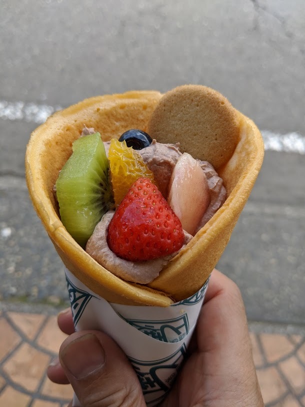 周りはクレープより厚めの生地で中にチョコレートホイップクリームとフルーツやいろいろ入ってる。