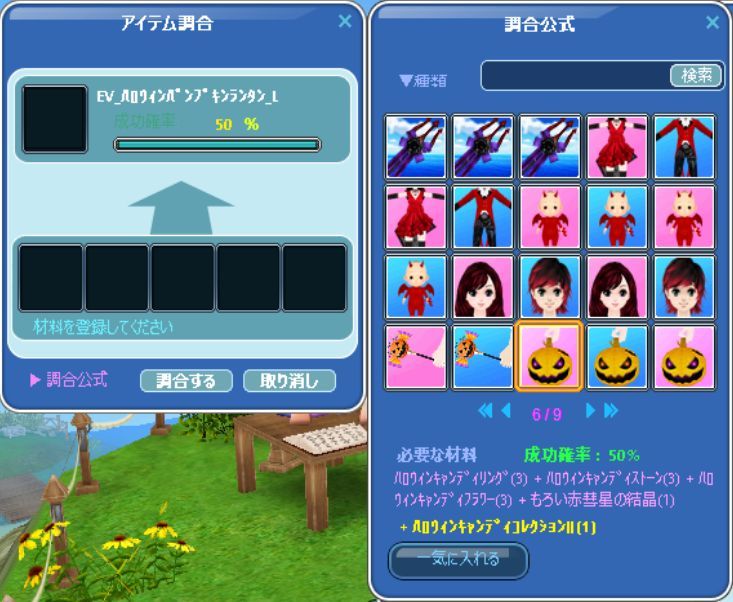 シャシャでおっかなびっくり、EV-ハロウィンランタン調合、一回でできました。