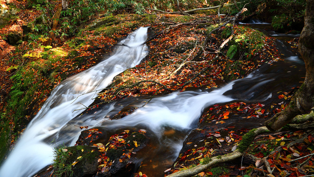水辺のね、黒く湿った岩と落ち葉の赤や黄色 っていいよね!