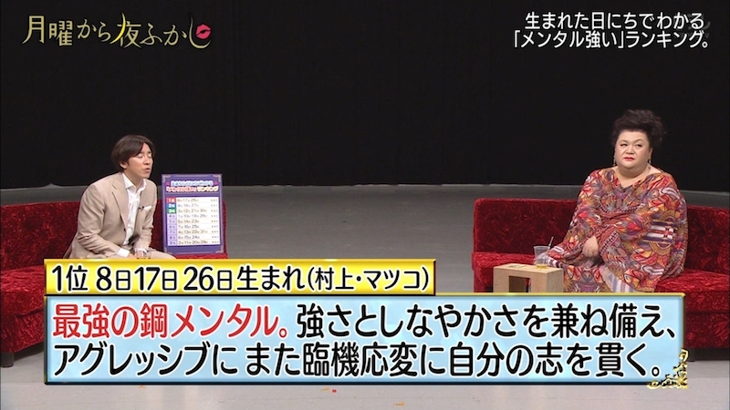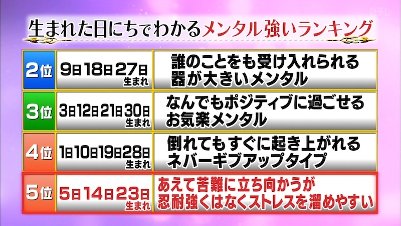 月曜から夜更かしで、生まれた日にちメンタルランキングというのがありました。
