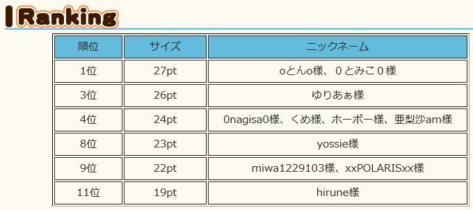 わぉ~~色々成功☆*:;;;;;:*お*:;;;;;:*め*:;;;;;:*で*:;;;;;:*と*:;;;;;:*う*:;;;;;:*イベ王19ポイントおしかったねぇ~~~~でも11位☆*:;;;; ;:*お*:;;;;;:*め*:;;;;;:*で*:;;;;;:*と*:;;;;;:*う*:;;;;;:* |