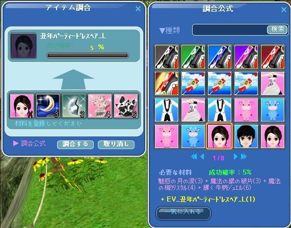 でも、レア材料の「輝く牛柄ジュエル」が露店で高価で数も少なく、お財布事情から出費は 4000 までと決めて・・・3回分を「駄目元」で購入~~調合成功したら大ラッキーの「一か八か」の運試し。