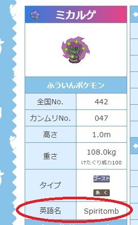 ある日「diarrhea」と名付けられたミカルゲというちょっとレアなポケモンが送られてきました。英語圏内から送られてきたポケモンは英語名になるのであまり気にしなかったのですが別の日に「Spiritomb」という名のミカルゲが来ました。どちらかがニックネームかぁと思ってどっちが正しいミカルゲの英語名かと調べたら「Spiritomb」が正しいミカルゲの英語名でした。